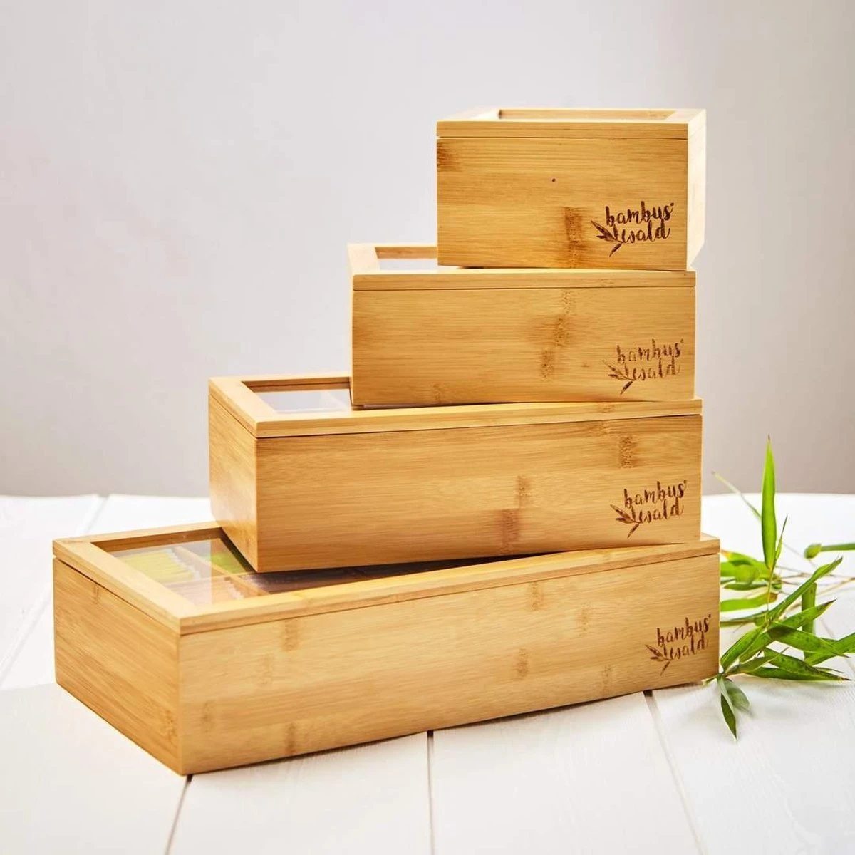 - materiaal: bamboe (kist), plastic glas (venster)