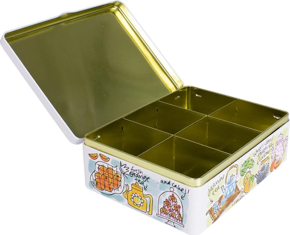 Blond-Amsterdam heeft voor alle thee fans dit theeblik ontworpen. Dit theeblik bestaat uit 6 vakken, zo kan jij je zes favorieten thee smaken opbergen in deze thee doos. Deze thee doos maak jouw tafel tijdens de thee helemaal af.