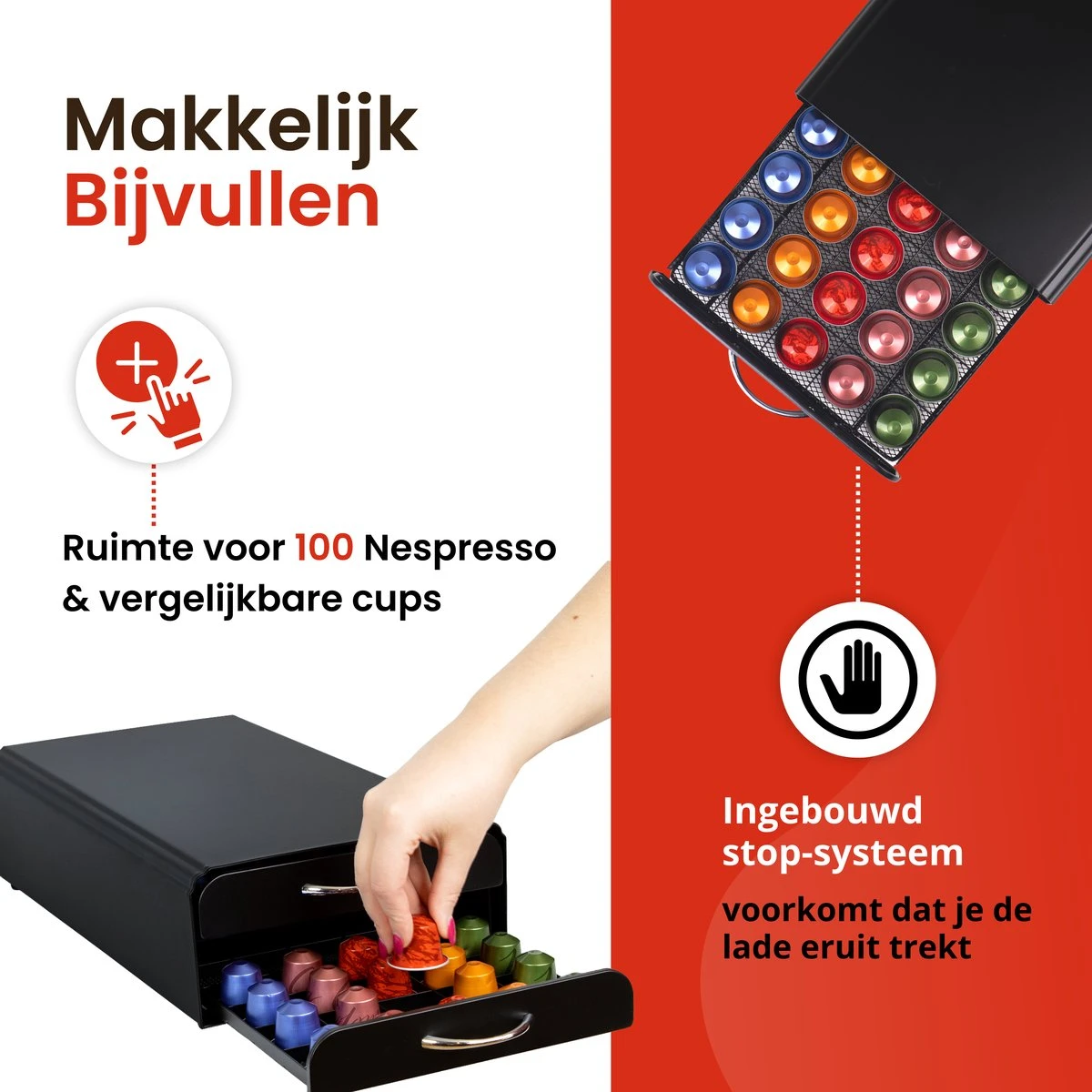 De lade bied ruimte tot wel 100 cups. De houder is opgedeeld in 2 lades met 5 rijen van 10 stuks, de houder werkt als uitschuifbare lade die gemakkelijk open dicht gaat, het is zo ontworpen dat je het koffiezetapparaat er bovenop kunt plaatsen om ruimte te besparen. zo heb je al je cups netjes binnen handbereik opgeborgen en neemt het weinig ruimte in beslag.