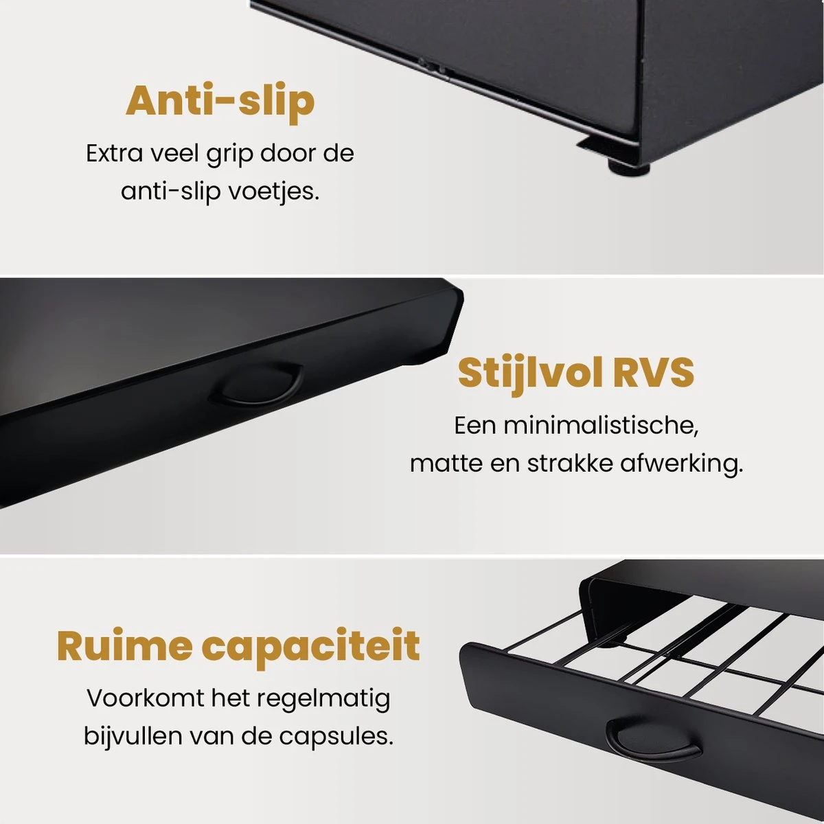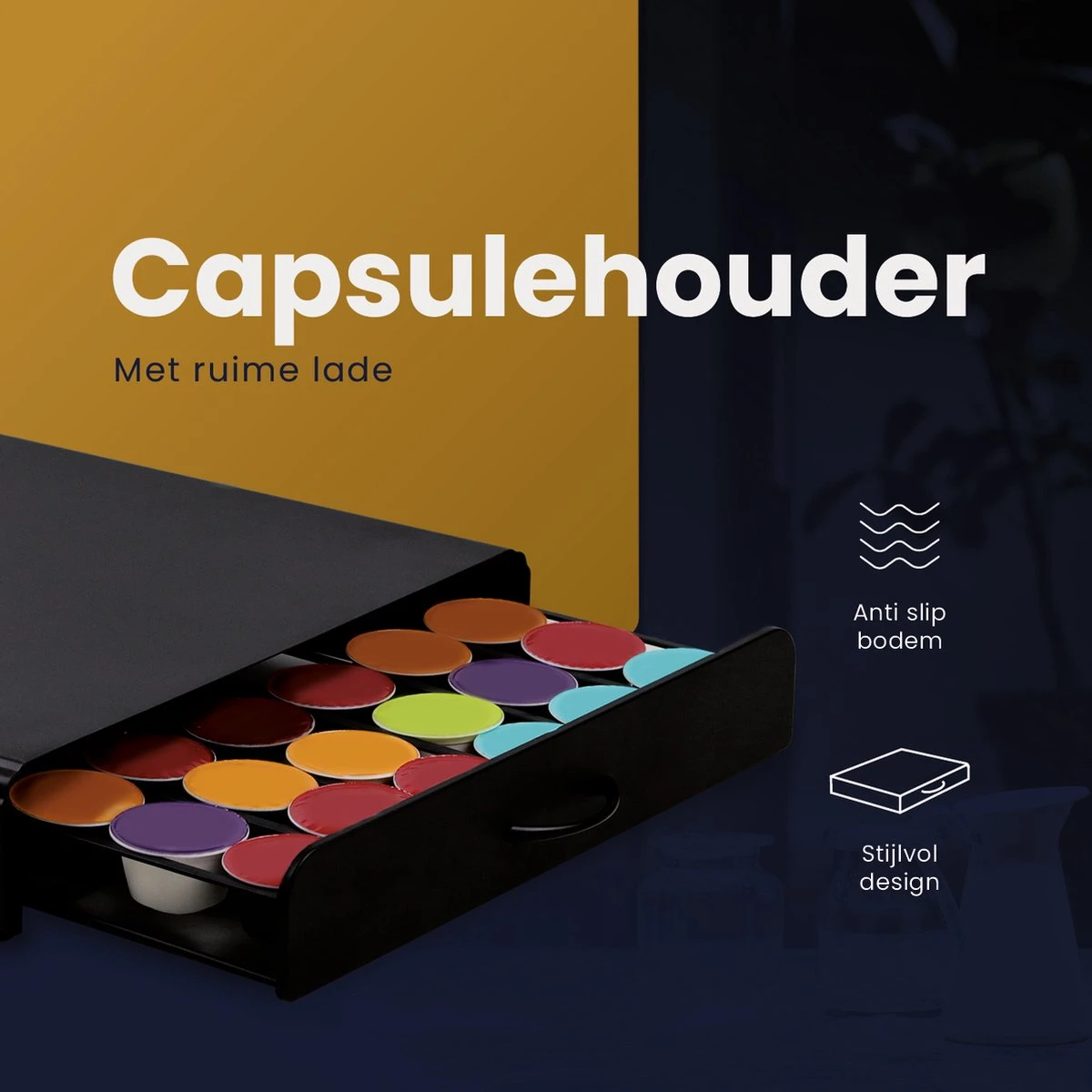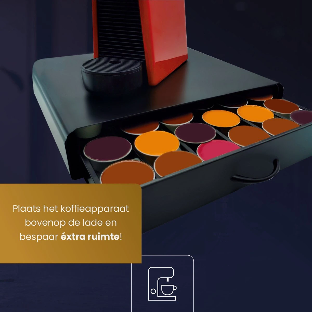 Onze capsulehouder is ontworpen als compacte lade; handig én ruimtebesparend. Zet je koffieapparaat of koffiekopjes simpelweg op de lade neer en haal het meeste uit je keukenruimte.