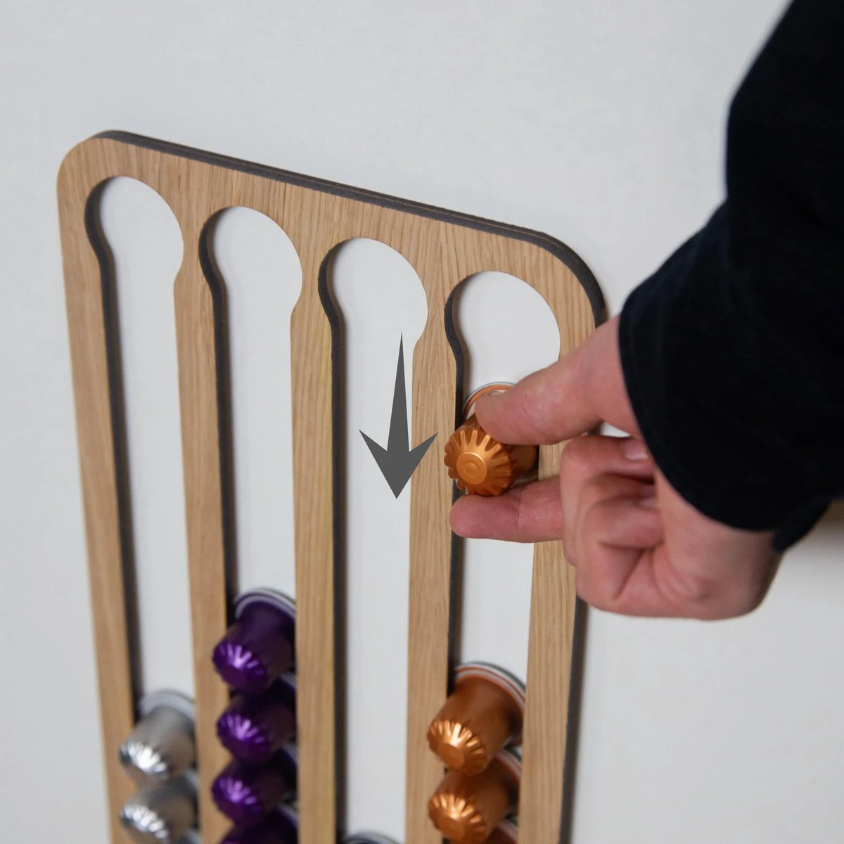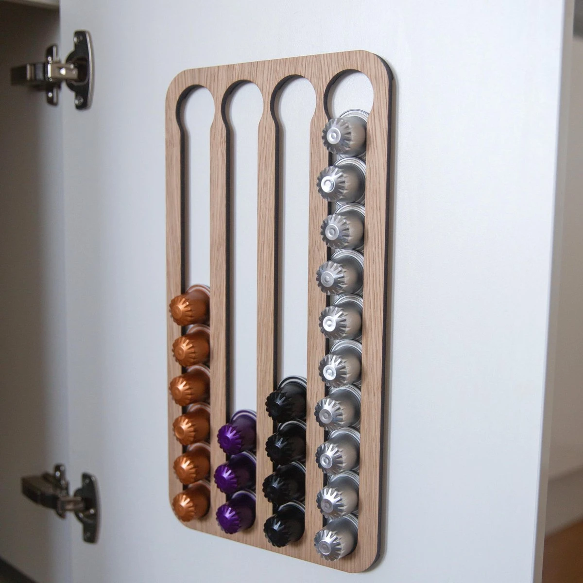 De capsulehouder is gemaakt van gefineerd eiken van 6 mm dik. Hierdoor heeft de capsulehouder een warme en luxe uitstraling en is elke houder uniek. De afstand houders zijn 3mm hoog zodat de capsules makkelijk in en uit kunnen worden genomen. Daarnaast, een eyecatcher in de keuken!