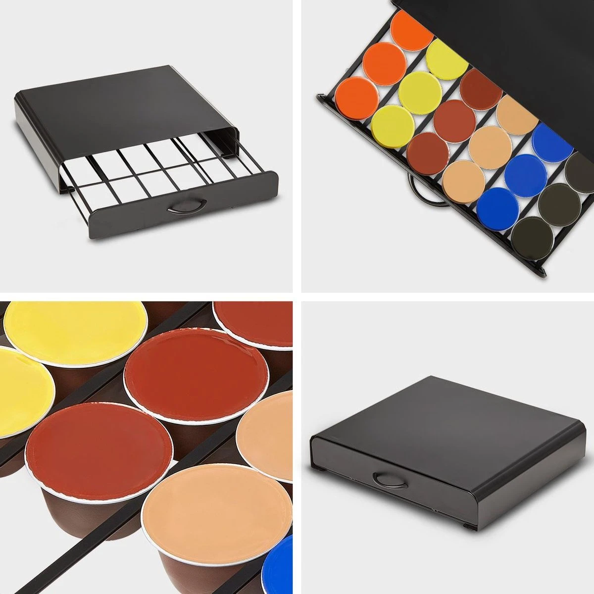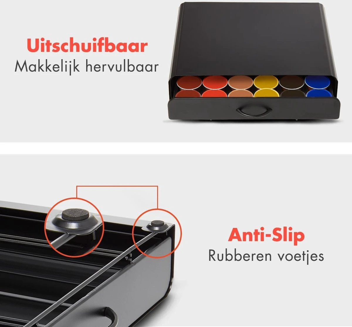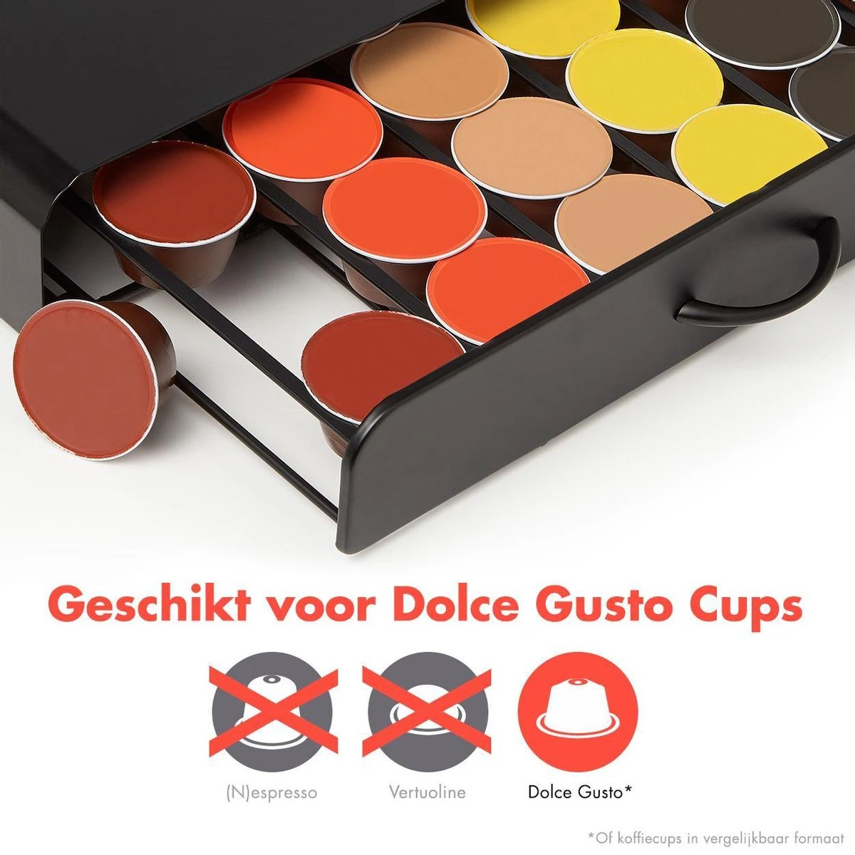 In de capsulehouder kun je tot wel 36 verschillende Dolce Gusto of vergelijkbare cups opbergen, de houder werkt als een lade die je gemakkelijk opentrekt. De lade is opgesplitst in zes verschillende rijen. Zo kun je gemakkelijk alle verschillende smaken op een overzichtelijke manier organiseren!