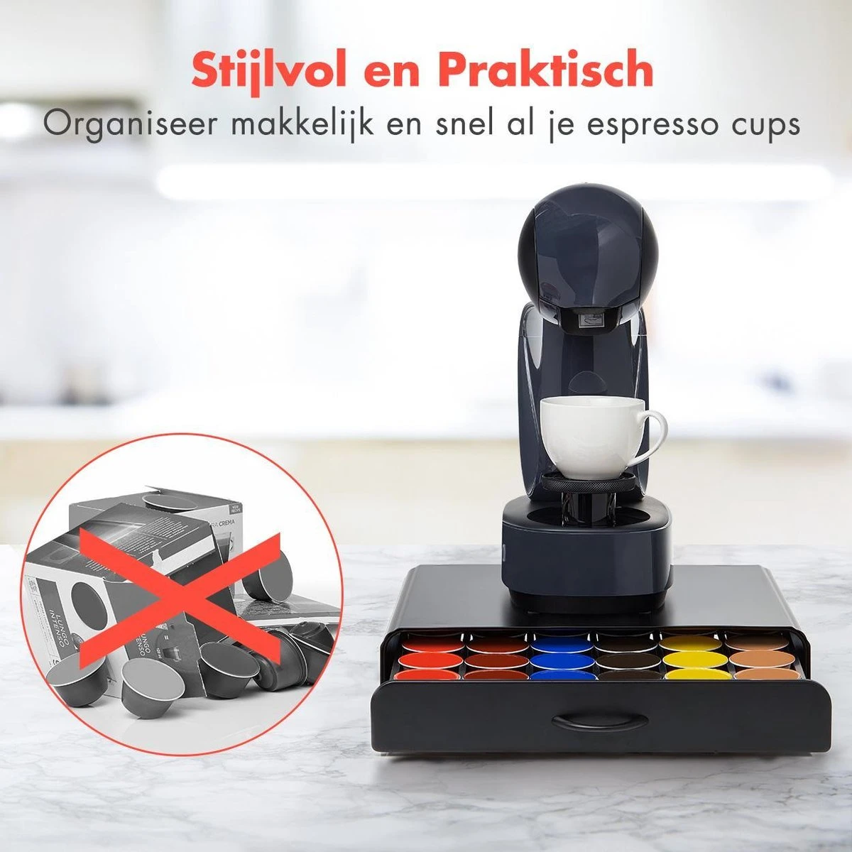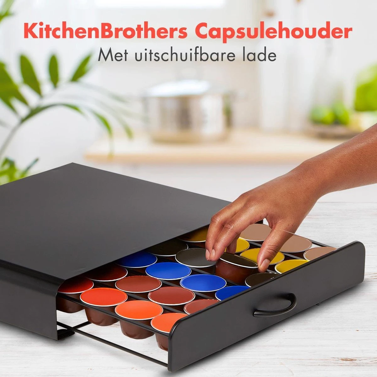Deze capsulehouder met lade van KitchenBrothers is snel, simpel en stijlvol. Met een capaciteit van 36 capsules en 6 verschillende rijen biedt het de ideale manier om je favoriete Dolce Gusto of vergelijkbare cups te organiseren. Tevens is hij ruimtebesparend en zeer praktisch! De houder is een ware must-have voor iedere koffieliefhebber.