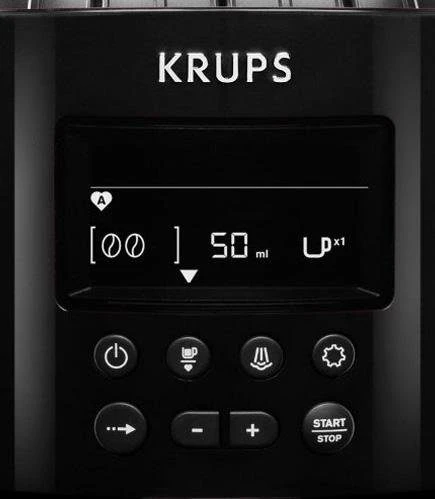 Ontdek nu deze compacte volautomaat van KRUPS. Met nieuw, intuïtief LCD-scherm en nog meer hoogwaardige uitvoeringskenmerken. Het gepatenteerde Compact Thermoblock System, de individuele instelmogelijkheden en het favorieten-menu zorgen voor professioneel koffiegenot. <br><br><b>Speciale eigenschappen: </b><br><ul> <li>Dit volautomatische koffiezetapparaat is ideaal voor verschillende koffievariaties – met of zonder melk! De automatische »CappuccinoPlus«-melkschuimer met aanzuigfunctie en melkreservoir van edelstaal schuimt de melk direct in het kopje op en zorgt voor perfect melkschuim.</li></ul><b>Overige specificaties: </b><br><ul> <li>Gepatenteerd Compact Thermoblock System: blijvend optimaal geperste koffie dankzij het koffiezethuis van edelstaal. Een perfecte smaak en een hoge temperatuur vanaf het eerste kopje door het verwarmingselement dat zich direct bij het koffiezethuis bevindt.</li><li>Automatisch reinigingsprogramma voor het eenvoudig en grondig schoonmaken van het gehele systeem inclusief koffiezet-unit.</li><li>Favorieten-menu: programmering van twee favoriete koffies door het naar wens instellen van de koffiesterkte, de waterhoeveelheid en de temperatuur</li><li>Auto-cappuccinosysteem: automatische melkschuimer met aanzuigfunctie voor perfect melkschuim incl. melkreservoir van edelstaal.</li></ul><b>Kenmerken & functies: </b><br><ul> <li>Gelijktijdige bereiding van 2 kopjes: ja</li><li>Kopjesplateau: verwarmd</li><li>Reservoir voor tweede, voorgemalen koffiesoort: ja</li><li>Timer & tijdsaanduiding: ja</li><li>In hoogte verstelbaar lekbakje: nee</li><li>In hoogte verstelbare koffietuit: ja</li><li>Uitneembare koffiezet-unit: ja</li><li>Automatische spoel- en reinigingsprogramma's: ja</li><li>Ontkalking: automatisch reinigingsprogramma</li><li>Maalwerk: geïntegreerd, verstelbaar metalen kegelmaalwerk</li><li>Maalgrofheid instelbaar: ja / 3 maalgrofheden</li><li>Instelbare hoeveelheid per kopje: elektronisch programmeerbaar</li><li>Heetwater-/stoomtuit: ja</li><li>Direct-stoomfunctie (2 doorloopverwarmers): ja</li><li>Melkopschuimer: edelstaal</li><li>Melkreservoir: ja</li><li>Programmafuncties: ja</li><li>Display: LCD-scherm</li><li>Kopjesverlichting: ja</li><li>Energiebesparende stand: ja</li><li>Automatische uitschakeling: ja</li></ul><b>Accessoires: </b><br><ul> <li>Starterset: 1 set van 2 reinigingstabletten, melkreservoir van edelstaal</li></ul><b>Technische gegevens: </b><br><ul> <li>Inhoud bonenreservoir (g): 275</li><li>Capaciteit waterreservoir (liter): 1,8</li><li>Capaciteit van de koffiedikhouder: ca. 12 porties</li><li>Pompdruk (bar): 15</li><li>Aansluiting: 1450 W</li><li>Afm. apparaat hxbxd (cm): 48,3×28,7×38,1</li><li>Gewicht (kg): 9,8 kg</li><li>Kleur: zwart</li><li>Gebruiksaanwijzing in: CS/ DA/ DE/ EL/ EN/ ES/ FR/ HU/ IT/ NL/ PL/ PT/ RU/ SK/ SV/ UK</li></ul>