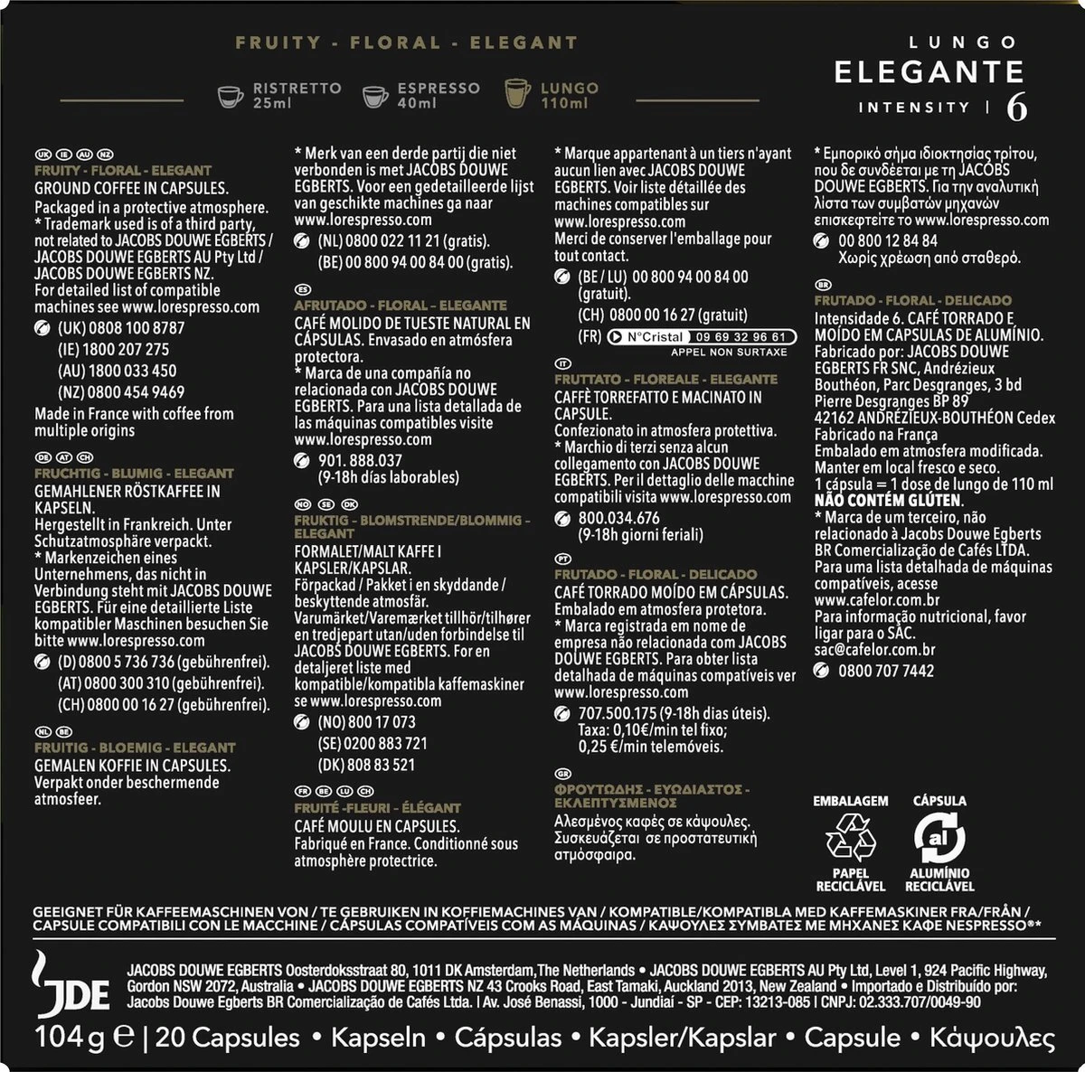 L’OR Lungo Elegante Koffiecups – Intensiteit 6/12 – 10 X 20 Capsules