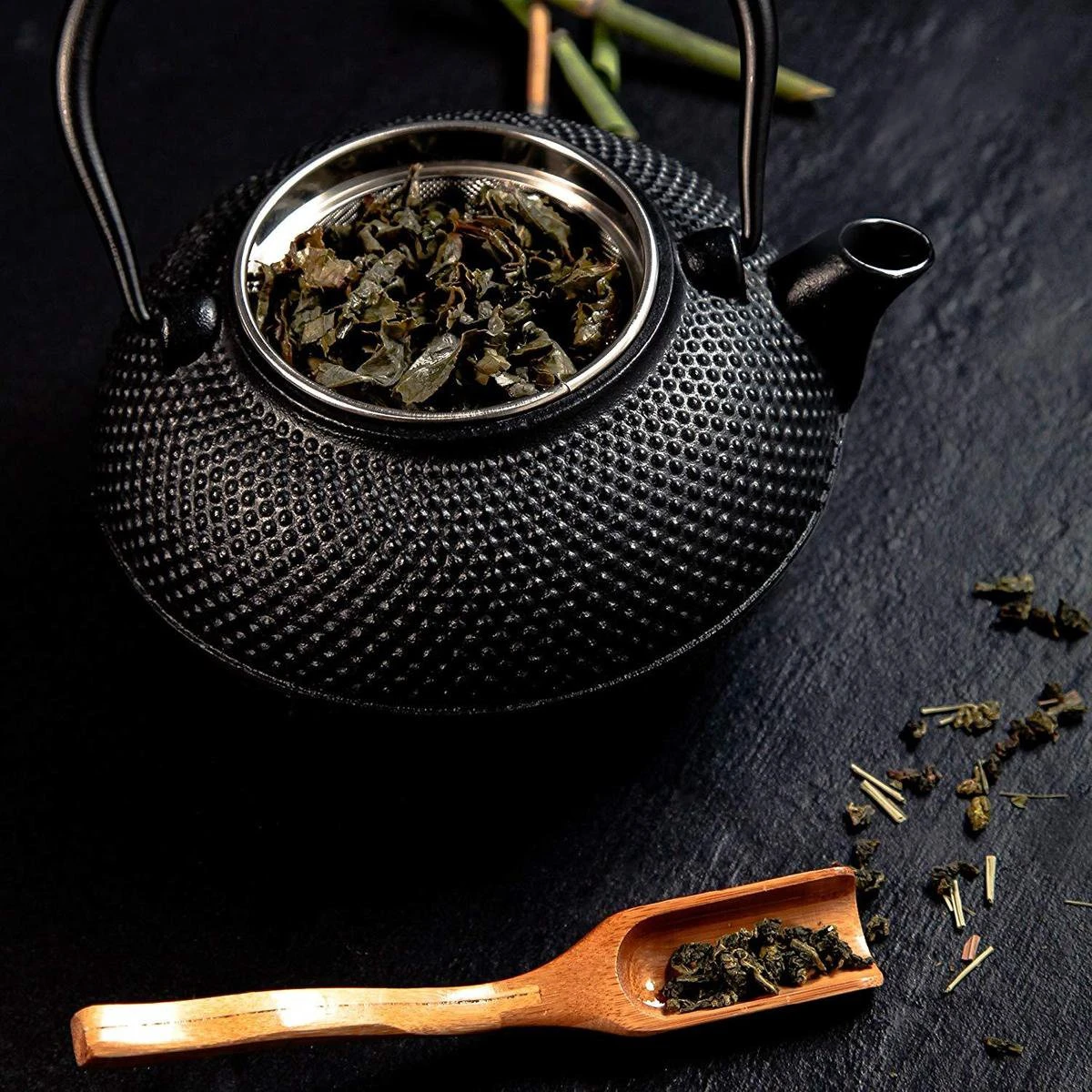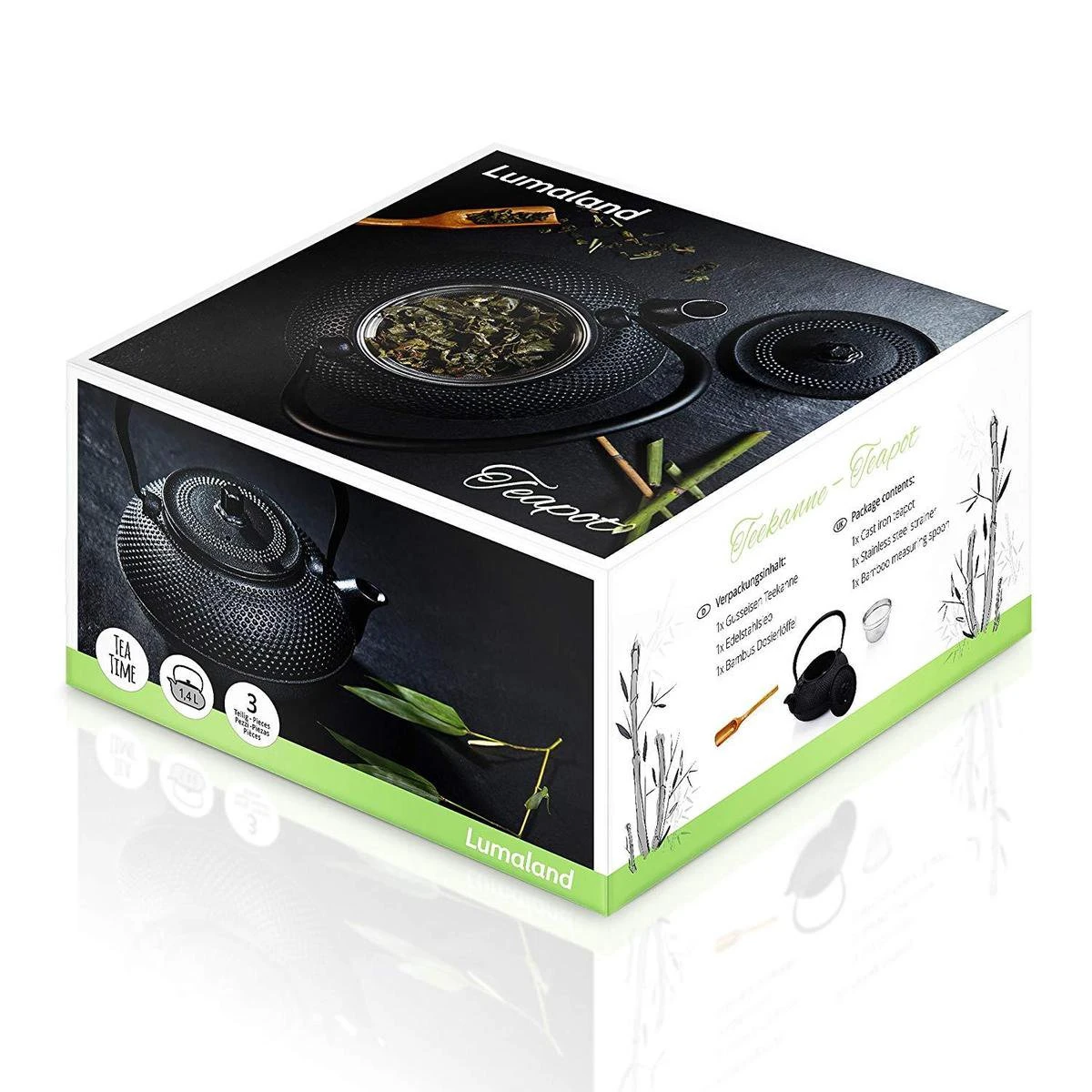 Al millenia heeft de theebereiding in gietijzeren theeaccessoires zich bewezen. Het theeservies van Lumaland bevat een gietijzeren pot (1,4L) en daarnaast een bamboe doseerlepel en gietijzeren zeef. Voor een ideale theebereiding zijn de meegeleverde doseerlepel van bamboe, de roestvrij stalen zeef en massieve warmer perfect.
