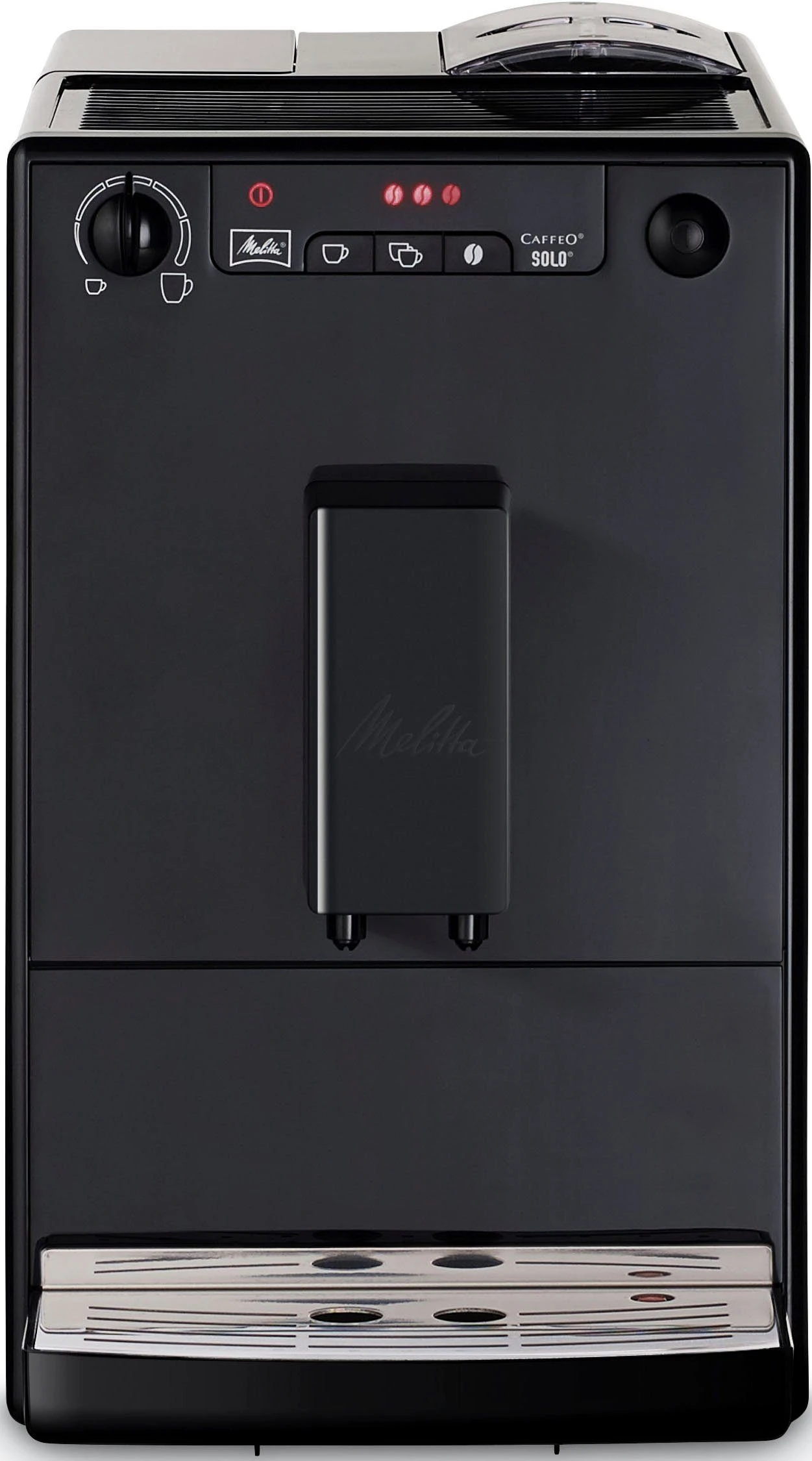 Koffiezetapparaat Caffeo® Solo® Pure Black E 950-222 van MELITTA®, voor genieten van heerlijke koffie. Met slechts één druk op de knop twee kopjes koffie tegelijkertijd bereiden. De Caffeo® Solo® is het perfecte volautomatische koffiezetapparaat voor de verwerking van hele koffiebonen. Dit elegante en kleine apparaat zorgt ervoor dat je heerlijk kunt genieten. <br><br><b>Speciale eigenschappen: </b><br><ul> <li>Kleine en compacte Melitta® CAFFEO ® SOLO ®, één van de smalste volautomatische koffiezetapparaten op de markt. Beperkt zich tot het essentiële, biedt een excellente koffie-ervaring door het genot van hele bonen. Zijn uitvoering, het puristische design en de aromatische beleving zullen echte espresso- en koffieliefhebbers weten te waarderen!</li></ul><b>Overige specificaties: </b><br><ul> <li>Sterkte van de koffie drievoudig instelbaar</li><li>Traploos instelbare waterhoeveelheid van 30-220 ml voor grote en kleine kopjes</li><li>Moderne energiebesparende functies en aan-uitschakelaar met 0 W-functie</li></ul><b>Kenmerken & functies: </b><br><ul> <li>Gelijktijdige bereiding van 2 kopjes: ja</li><li>Kopjesplateau: ja, met passieve warmhoudfunctie</li><li>Reservoir voor tweede, voorgemalen koffiesoort: nee</li><li>Timer & tijdsaanduiding: nee</li><li>In hoogte verstelbaar lekbakje: nee</li><li>In hoogte verstelbare koffietuit: ja (tot 135 mm)</li><li>Uitneembare koffiezet-unit: ja</li><li>Automatische spoel- en reinigingsprogramma's: ja</li><li>Ontkalking: automatisch</li><li>Maalwerk: staal-kegelmaalwerk</li><li>Maalgrofheid instelbaar: ja</li><li>Instelbare hoeveelheid per kopje: waterhoeveelheid traploos in te stellen van 30-220 ml</li><li>Heetwater-/stoomtuit: nee</li><li>Direct-stoomfunctie (2 doorloopverwarmers): nee</li><li>Melkopschuimer: nee</li><li>Melkreservoir: nee</li><li>Programmafuncties: automatische reinigings,- ontkalkings- en spoelprogramma's</li><li>Display: display met rode LED-symbolen</li><li>Kopjesverlichting: nee</li><li>Energiebesparende stand: ja</li><li>Automatische uitschakeling: ja</li></ul><b>Extra functies: </b><br><ul> <li>Werktemperatuur drievoudig programmeerbaar (87 °C/90 °C/93 °C), stalen kegelmaalwerk, display met rode LED-symbolen, passief verwarmd kopjesplateau, edelstalen uitdruprek, afneembaar waterreservoir met automatische bewaking van de waterstand, geschikt voor gebruik met een waterfilter</li></ul><b>Technische gegevens: </b><br><ul> <li>Inhoud bonenreservoir (g): 125 g</li><li>Capaciteit waterreservoir (liter): 1,2</li><li>Capaciteit van de koffiedikhouder: 6-8</li><li>Pompdruk (bar): 15</li><li>Aansluiting (W/V/frequentie): 1.400/220-240/50-60</li><li>Afm. apparaat hxbxd (cm): 32,5×20,0x45,5</li><li>Gewicht (kg): 8</li><li>Kleur: zwart</li></ul>