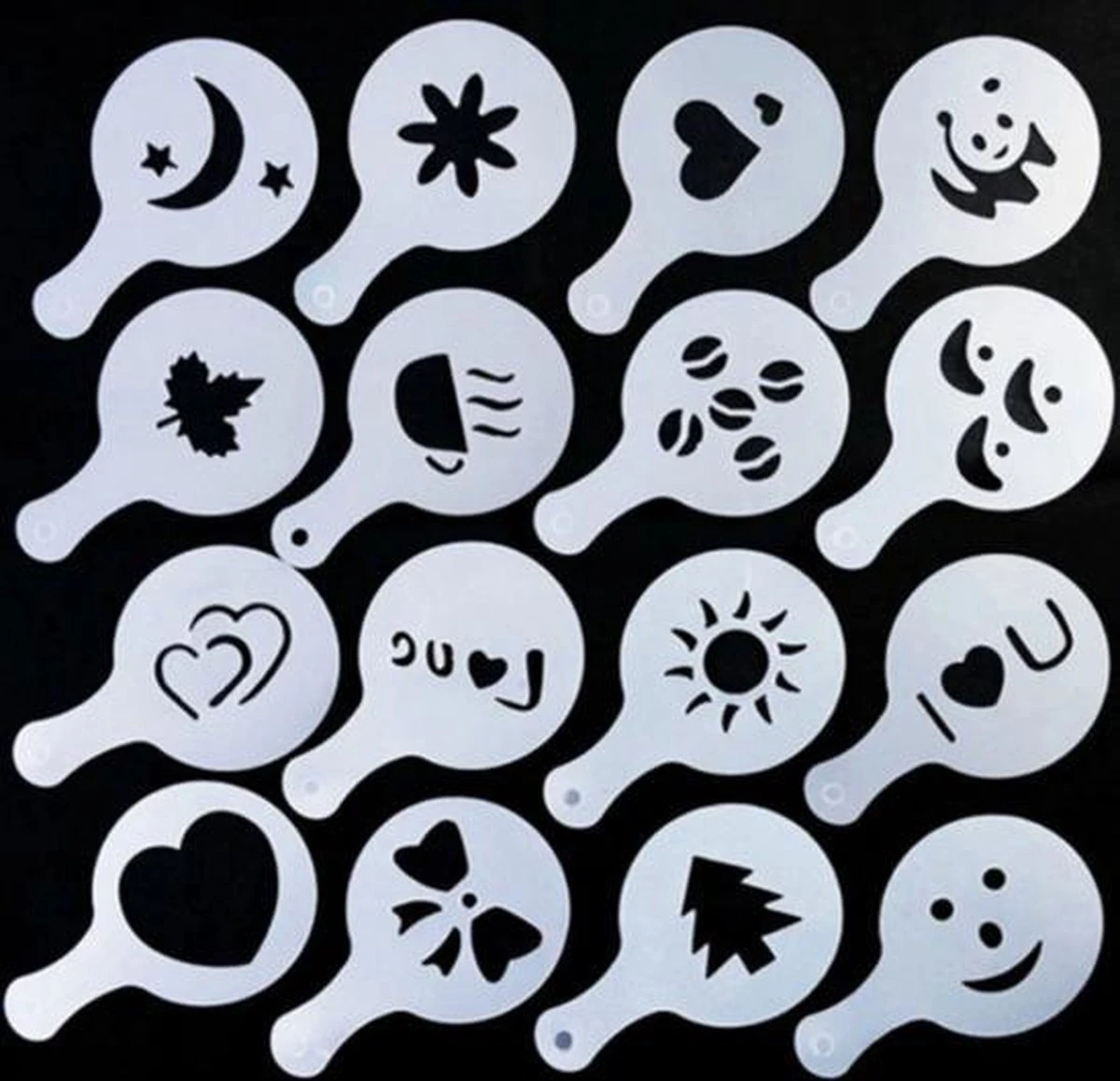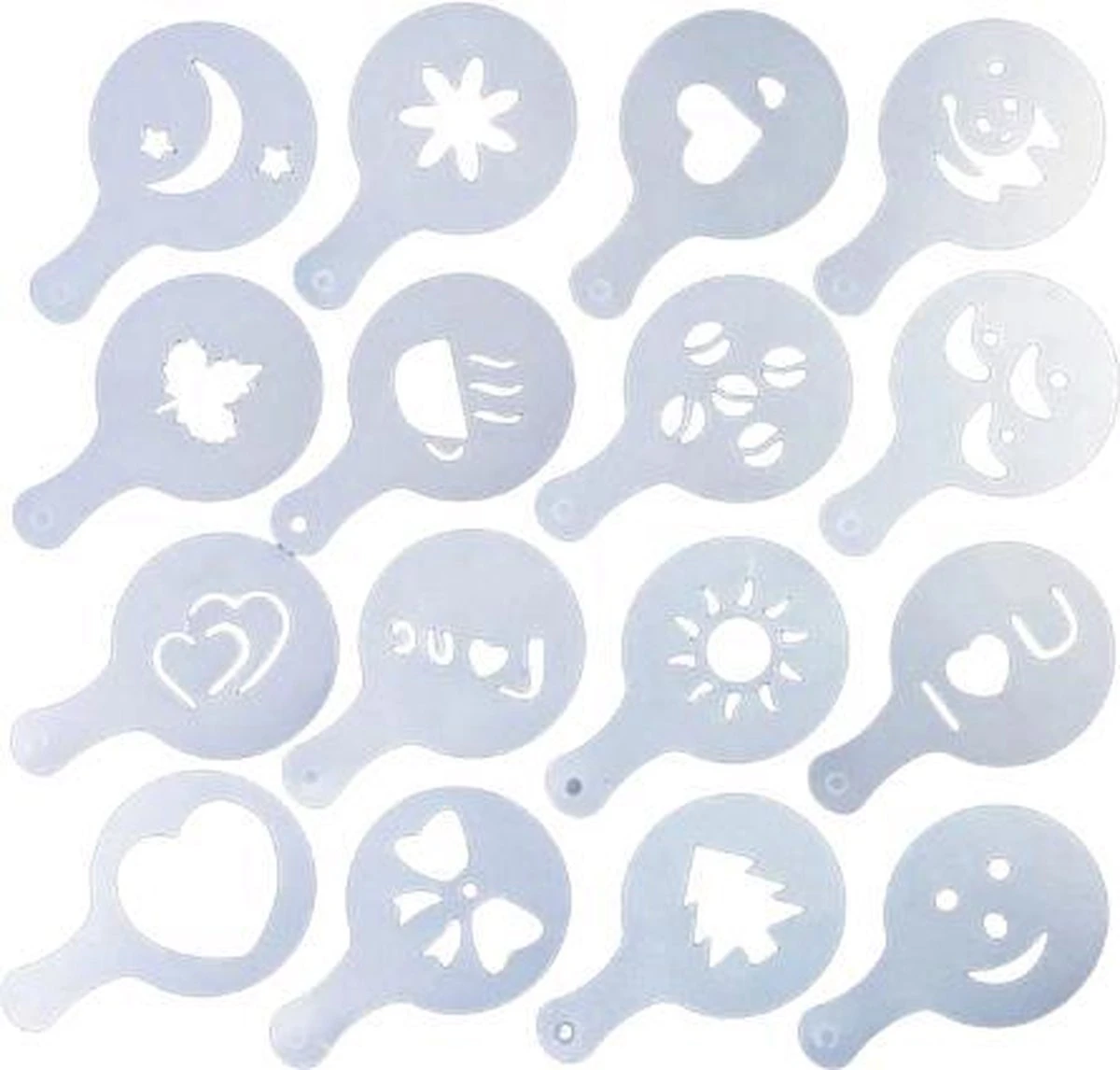 Versier uw cappuccino, caffè latte of latte macchiato door cacao met een strooier op een van deze deze 16 sjablonen en de geschuimde melk te strooien. Met de cappuccino sjablonen zijn ook chocolademelk, cupcakes, koekjes, taart en bijvoorbeeld soep te versieren.