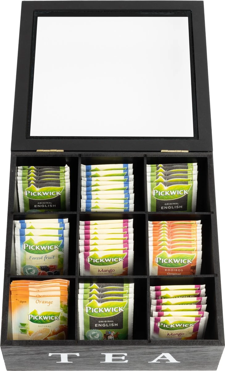 Theekist – Zwart – Hout 9-Vaks – Glazen Deksel – Theedoos