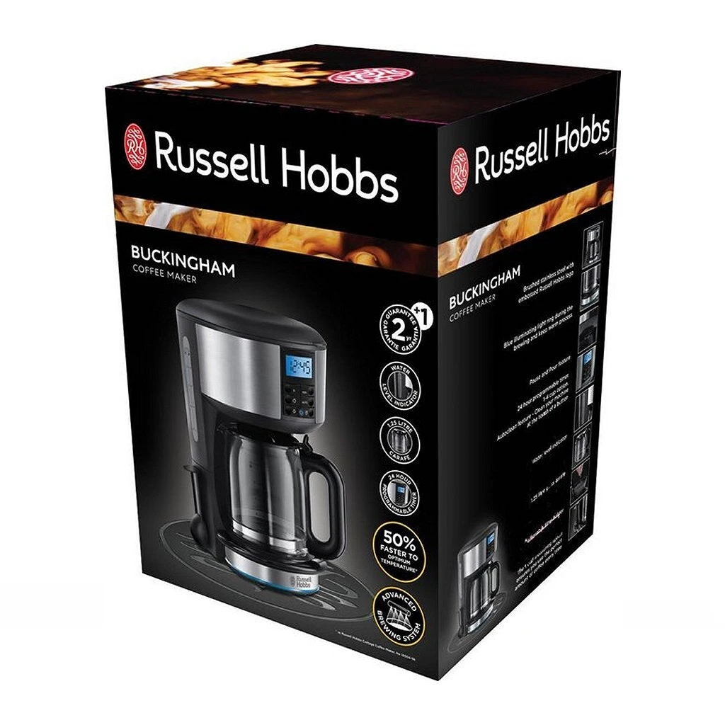Het heeft een programmeerbare 24-uurstimer waarmee je het apparaat van tevoren zo kunt instellen dat je kopje koffie bijvoorbeeld ’s ochtends vroeg of ’s avonds na het eten voor jou klaarstaat. Een blauw verlichte ring gaat aan tijdens het zetten en blijft aan zolang de koffie warm wordt gehouden. Het Buckingham Koffiezetapparaat is bovendien prachtig compact en stijlvol. Het apparaat heeft een glazen kan met een capaciteit van 1,25 liter waarmee je 10 koppen kunt zetten en kan ook ingesteld worden op 2-4 koppen.